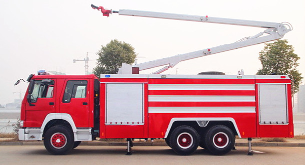 舉高噴射消防車:簡稱高噴消防車、是一款非常多功能的救援類車型,由于普通水罐消防車、泡沫消防車只能從原地射水進行滅火,在有些比較復雜的地方比較局限,而高噴的作用是可以將消防炮高高的舉起,可以精確的對著火點進行快速的滅火,使得火情可以得到有效的撲滅。所以一般大型消防隊都有配備的!它是由折疊伸縮臂結構、電動遙控消防炮、罐體及二類底盤組成,臂架為基本臂(二節臂、三節臂、四節臂),臂端安裝進口的電子遙控消防炮,消防隊員通過電動遙控遙控消防炮在高空中從多個角度靈活地噴霧、噴水或者噴射泡沫進行撲救一般火災。